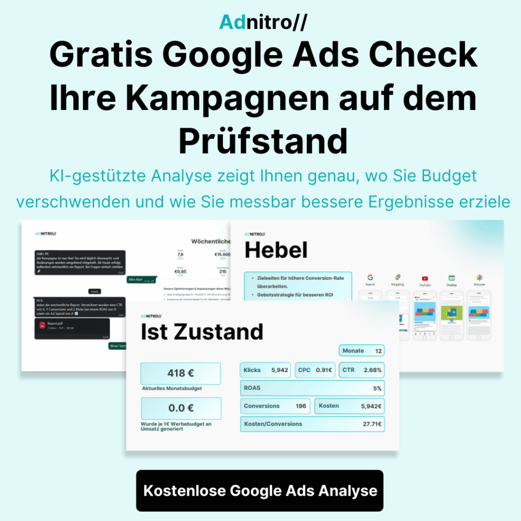 Jetzt kostenlose Google Ads Analyse sichern – https://adnitro.de/google-ads-analysis/ wir prüfen Konto, Kampagnenstruktur, Keywords, Anzeigentexte, Assets und Tracking.